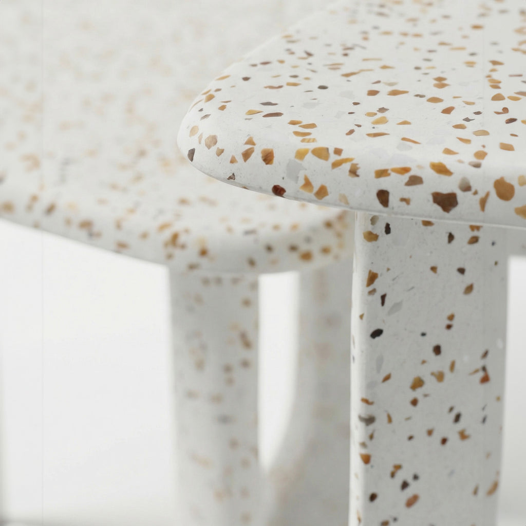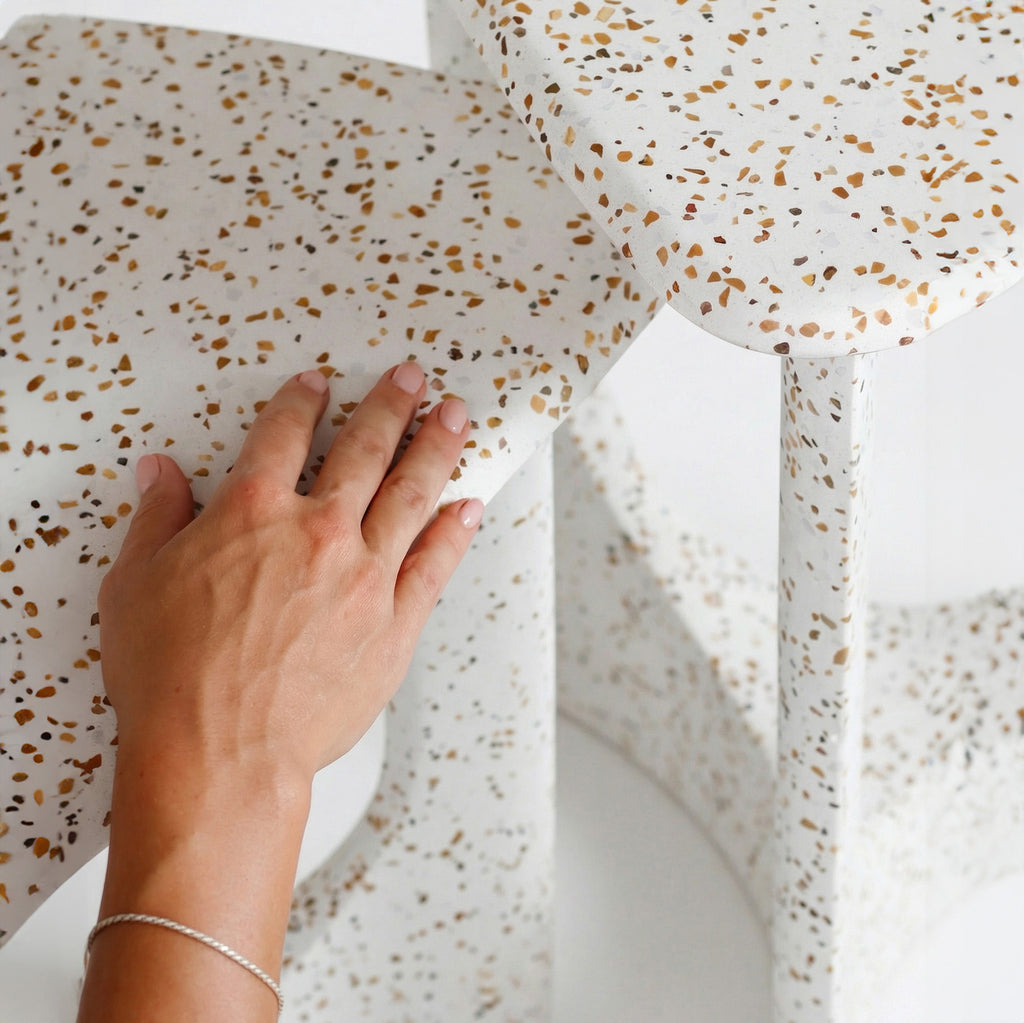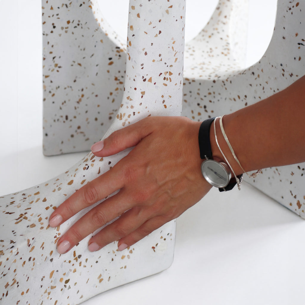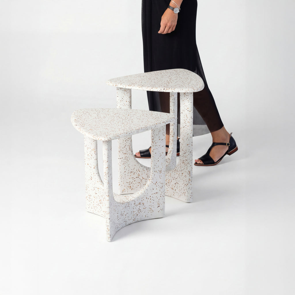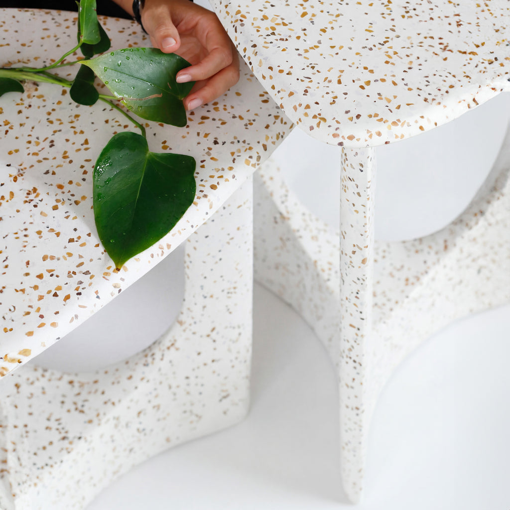 As Mesas de Apoio Arco, inspiradas no icônico Aqueduto da Carioca, são produzidas em granilite, material que já se tornou uma marca registrada do Mezas.